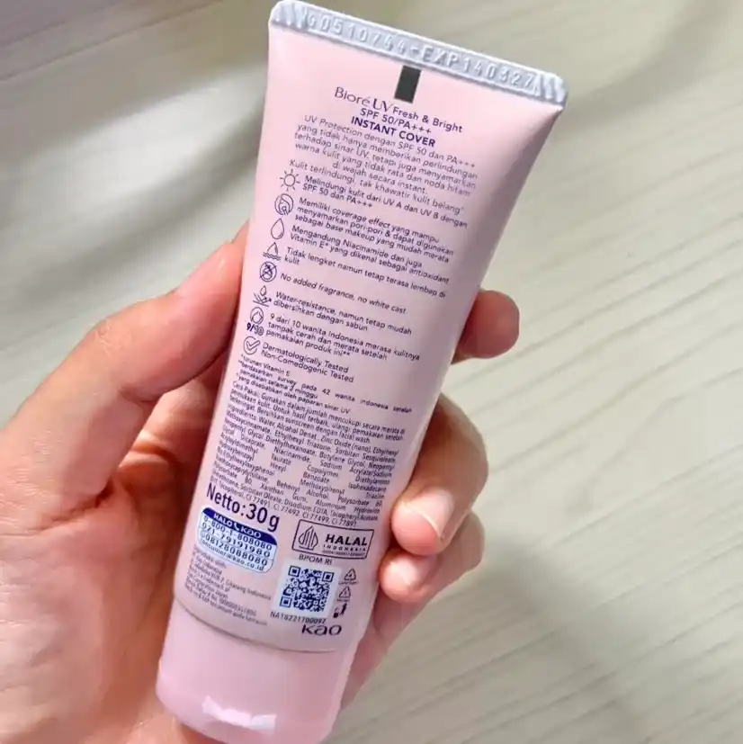 Berikut kandungan (ingredients) Fresh & Bright Biore Sunscreen Instant Cover: Water, alcohol denat, Zinc oxide (nano), ethylhexyl methoxycinnamte, ethylhexyl triazone, sorbitan sesquioleate, Neopentyl Glycol diethylhexanoate, butylene Glycol, Neopentyl Glycol dicaprate, niacinamide, sodium Acrylate/sodium acrylolyl dimethyl taurate Copolymer, diethylamino hydroxybenzoyl hexyl benzoate, Isohexadecane, bis ethylhexyloxyphenol Methoxyphenyl triazine, Triethoxycaprylylsilane, behenyl alcohol, polysorbate 60 0, polysorbate 80, Xanthan gum, aluminum hydroxide, dimethicone, sorbitan oleate, disodium edta, tocopheryl acetate, BHT, Tocopherol, Cl77491, Cl77499, Cl77891